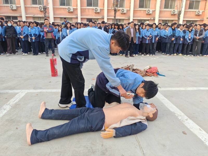 演练不止于“疏”,更重于“防”。技工教育部同步开展消防实务培训,通过灭火器实操演练让师生熟练掌握灭火技能;委培学生现场演示急救流程,助力同学们提升自救互救能力。此次演练有效提升了学院应急疏散组织管理水平,强化了师生安全意识与避险技能。