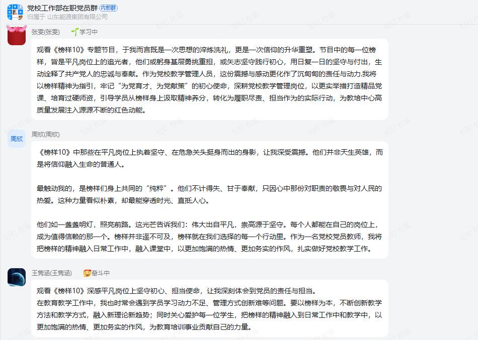 节目播出期间及结束后,党支部党员工作群内热闹非凡,党员们纷纷晒出观看照片,分享心得体会,掀起了线上学习交流的热潮。“榜样们在平凡岗位上做出了不平凡的业绩,他们的坚守与奉献,让我深刻理解了共产党员的责任与担当。作为党校工作者,我将以榜样为镜,在理论研究和教学服务中践行初心使命。”“从科技攻关到乡村振兴,从基层治理到国防建设,榜样们用实际行动诠释了‘为人民服务’的根本宗旨,今后我将把这份感动转化为工作动力,立足本职岗位履职尽责、担当作为。”“节目中的基层党组织充分发挥战斗堡垒作用,凝聚起干事创业的强大合力,这也为我们党支部建设提供了宝贵经验,今后要进一步强化凝聚力和战斗力。”一句句真挚的感悟、一声声坚定的表态,彰显了全体党员向榜样看齐、向先进学习的思想自觉和行动自觉。
