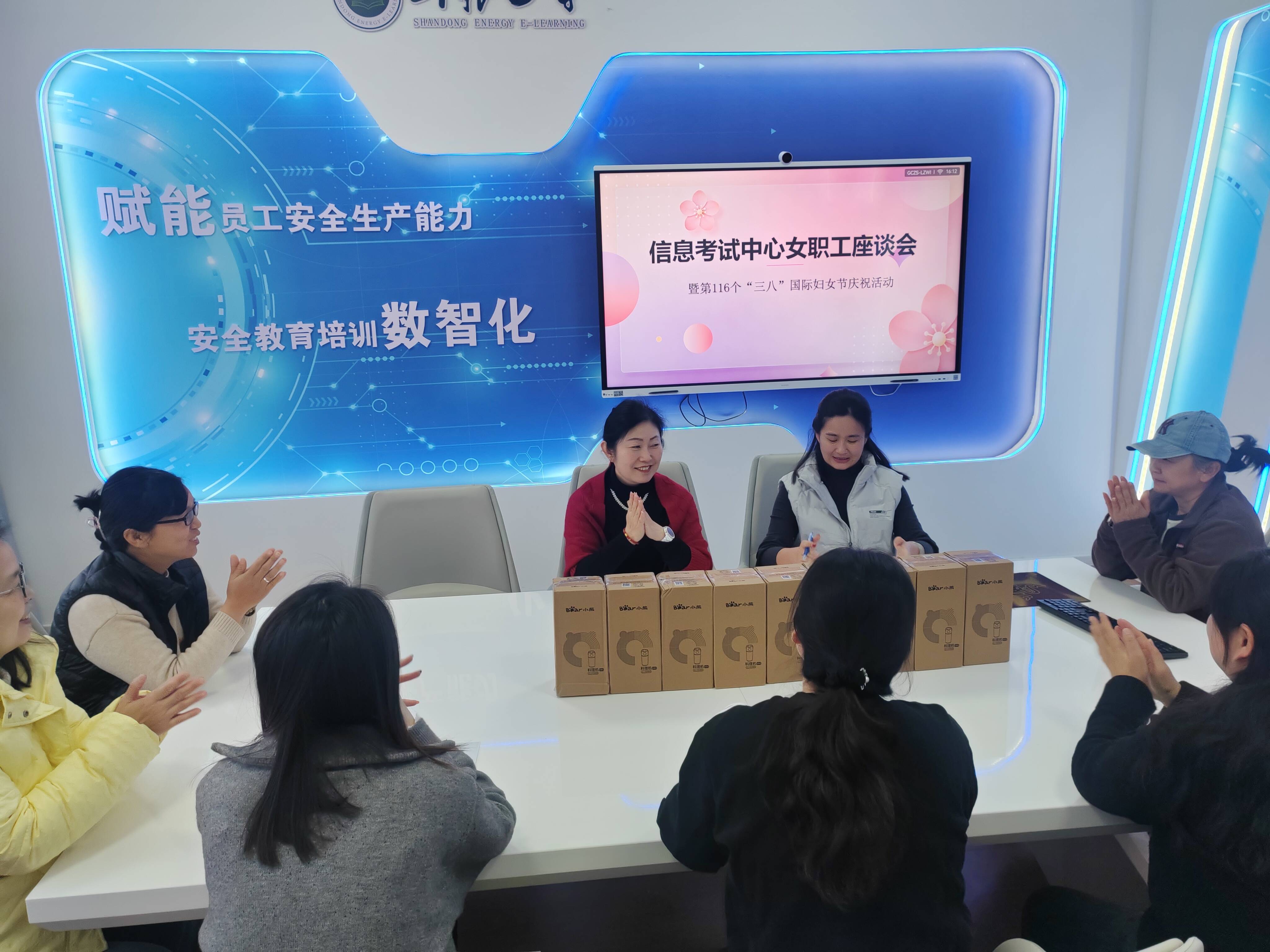 阳春三月,草长莺飞。在第116个“三八”国际妇女节来临之际,为体现对女职工的深切关怀与尊重,丰富女职工的精神文化生活,增强团队凝聚力与向心力,信息考试中心于3月6日下午在电教楼二楼山能e学会议室精心组织了一场温馨而富有意义的女职工座谈会。部室全体女职工欢聚一堂,在轻松愉悦的氛围中同庆专属节日,畅谈工作生活,凝聚发展共识。