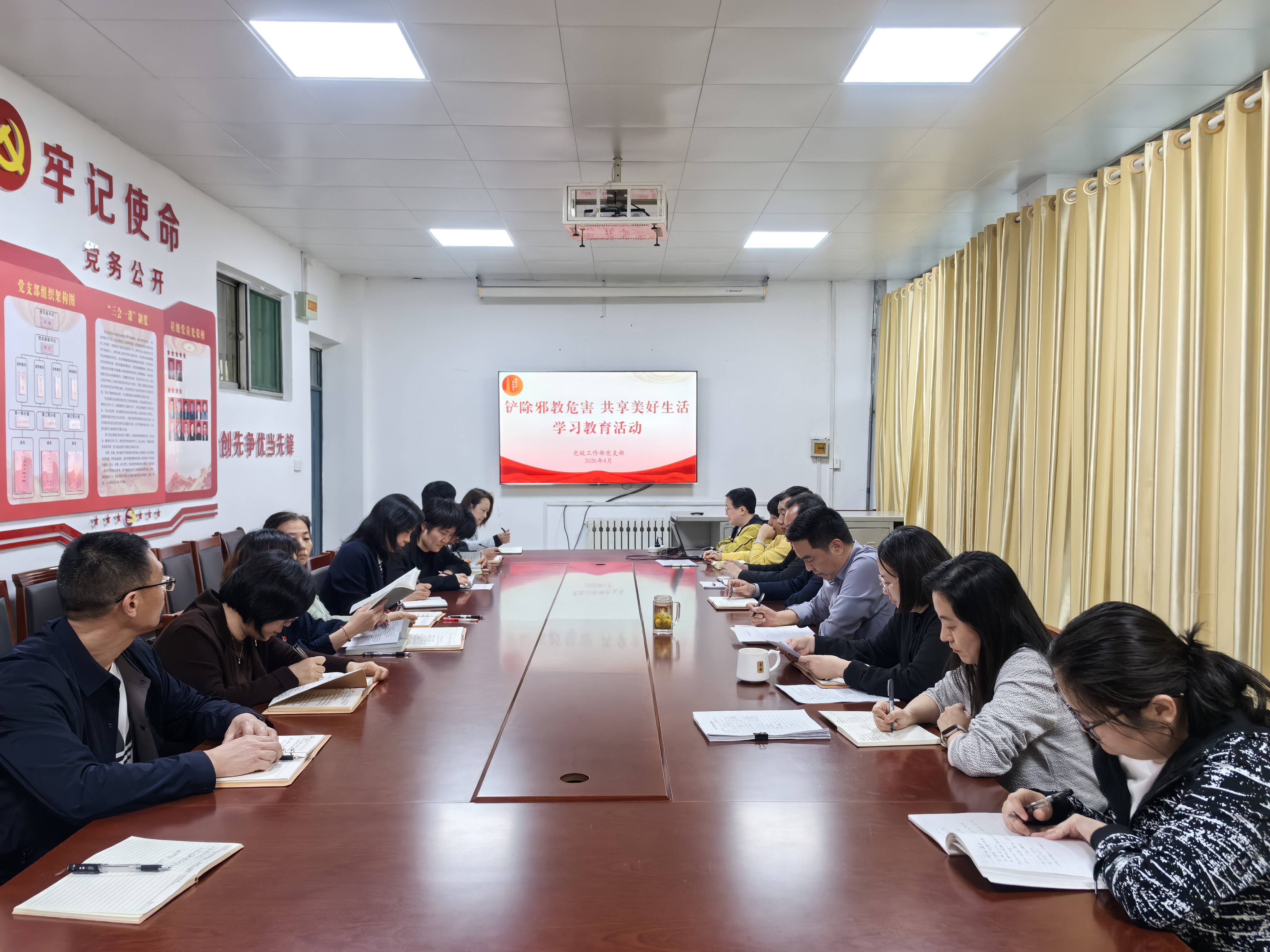 为切实筑牢教职工思想防线,破除邪教思想侵蚀,强化全员识邪、防邪、拒邪能力,近日,党校工作部党支部组织开展“铲除邪教危害 共享美好生活”学习教育,以案例警示、影像教学、承诺践诺的多元形式,开展沉浸式反邪教警示教育,引导全体教职工崇尚科学、远离邪教、坚守初心。